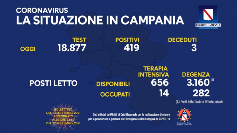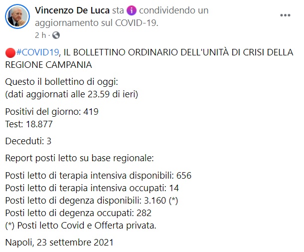 Questo quanto apprendiamo dalla pagina fb del Pres. De luca: "COVID19, IL BOLLETTINO ORDINARIO DELL'UNITÀ DI CRISI DELLA REGIONE CAMPANIA Questo il bollettino di oggi: (dati aggiornati alle 23.59 di ieri) Positivi del giorno: 419 Test: 18.877 Deceduti: 3 %u200B Report posti letto su base regionale: Posti letto di terapia intensiva disponibili: 656 Posti letto di terapia intensiva occupati: 14 Posti letto di degenza disponibili: 3.160 (*) Posti letto di degenza occupati: 282 (*) Posti letto Covid e Offerta privata. Napoli, 23 settembre 2021"