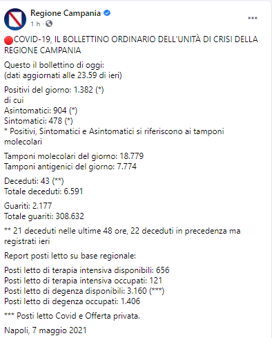 Asintomatici: 904 (*) Sintomatici: 478 (*) * Positivi, Sintomatici e Asintomatici - si legge nel post - si riferiscono ai tamponi molecolari tamponi molecolari del giorno: 18.779 Tamponi antigenici del giorno: 7.774. Deceduti: 43 (**) Totale deceduti: 6.591. Guariti: 2.177 Totale guariti: 308.632 ** 21 deceduti nelle ultime 48 ore, 22 deceduti in precedenza ma registrati ieri. Report posti letto su base regionale: Posti letto - prosegue il post - di terapia intensiva disponibili: 656. Posti letto di terapia intensiva occupati: 121 Posti letto di degenza disponibili: 3.160 (***) Posti letto di degenza occupati: 1.406. *** Posti letto Covid - conclude il post - e Offerta privata. Napoli, 7 maggio 2021"