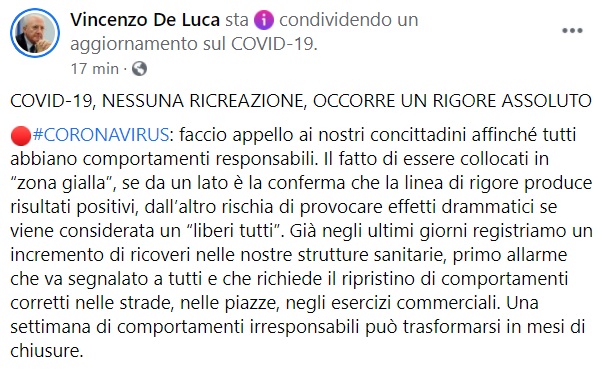 Covid Campania. L'appello del Pres. De Luca ai cittadini: "Nessuna ricreazione, occorre un rigore assoluto"