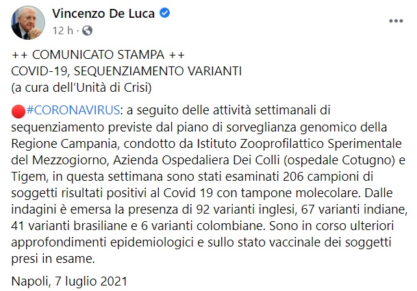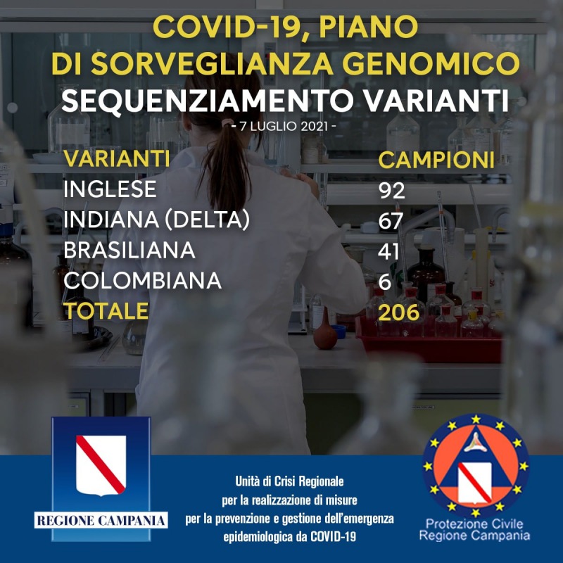 "++ COMUNICATO STAMPA ++ COVID-19, SEQUENZIAMENTO VARIANTI (a cura dell’Unità di Crisi). #CORONAVIRUS: a seguito delle attività settimanali di sequenziamento previste dal piano di sorveglianza genomico della Regione Campania, condotto- si legge nella nota- da Istituto Zooprofilattico Sperimentale del Mezzogiorno, Azienda Ospedaliera Dei Colli (ospedale Cotugno) e Tigem, in questa settimana sono stati esaminati 206 campioni di soggetti risultati positivi al Covid 19 con tampone molecolare. Dalle indagini è emersa la presenza di 92 varianti inglesi, 67 varianti indiane, 41 varianti brasiliane e 6 varianti colombiane. Sono in corso- si legge nella nota- ulteriori approfondimenti epidemiologici e sullo stato vaccinale dei soggetti presi in esame."