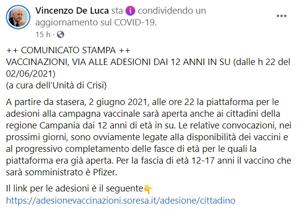 "VACCINAZIONI, VIA ALLE ADESIONI DAI 12 ANNI IN SU (dalle h 22 del 02/06/2021) (a cura dell’Unità di Crisi). A partire da stasera, 2 giugno 2021, alle ore 22 la piattaforma per le adesioni alla campagna vaccinale sarà aperta- si legge nella nota- anche ai cittadini della regione Campania dai 12 anni di età in su. Le relative convocazioni, nei prossimi giorni, sono ovviamente legate alla disponibilità dei vaccini e al progressivo completamento delle fasce di età per le quali la piattaforma era già aperta. Per la fascia di età 12-17 anni il vaccino che sarà somministrato è Pfizer."