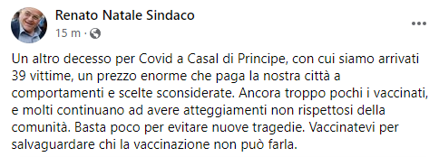 Questo il post pubblicato sulla sua pagina Facebook dal sindaco di Casal di Principe Renato Natale: "Un altro decesso per Covid a Casal di Principe, con cui siamo arrivati 39 vittime, un prezzo enorme che paga la nostra città a comportamenti e scelte sconsiderate. Ancora troppo pochi i vaccinati, e molti continuano ad avere - si legge nel post - atteggiamenti non rispettosi della comunità. Basta poco per evitare nuove tragedie. Vaccinatevi per salvaguardare chi la vaccinazione non può farla".
