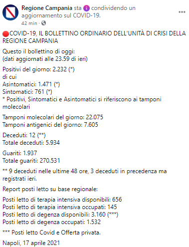 Questo il post pubblicato sulla pagina Facebook 'Regione Campania': "Comunicato stampa. Covid-19, anticipazione ordinanza n.14 del 17 aprile 2021. Orari esercizi commerciali e trasporto pubblico (a cura dell'Unità di crisi). Coronavirus: sarà pubblicata oggi l'Ordinanza n.14 del Presidente che contiene ulteriori disposizioni - si legge nella nota - in materia di prevenzione del contagio a partire da lunedì prossimo, connesse all'inserimento della Campania in "zona arancione". Se ne anticipano i contenuti. Vincenzo De Luca 1.1 A decorrere dal 19 aprile 2021 e fino al 15 maggio 2021, l’apertura degli esercizi commerciali e dei servizi alla persona (barbieri, parrucchieri, estetisti) è permessa, al fine di agevolarne la fruizione dilazionata - prosegue la nota - da parte degli utenti, in deroga ad eventuali disposizioni più restrittive, dalle ore 7,00 alle ore 21,30 e senza obbligo di chiusura domenicale o settimanale, fermo il rispetto della normativa a tutela dei lavoratori dipendenti. 1.2. In funzione della ripresa in sicurezza delle attività di cui al punto precedente e delle attività didattiche in presenza, ai sensi dell’art. 2 del decreto legge 1 aprile 2021, n.44, è disposta - conclude la nota - la riattivazione dei servizi aggiuntivi del Trasporto Pubblico Locale in tempo utile a consentire l’operatività dei servizi scolastici nel rispetto delle vigenti disposizioni in tema di limiti alle presenze a bordo dei mezzi e delle altre disposizioni vigenti".