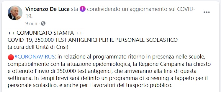 Questo quanto pubblicato sulla pagina fb del Pres. De Luca