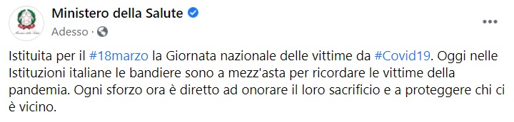 "Istituita per il #18marzo la Giornata nazionale delle vittime da #Covid19. Oggi nelle Istituzioni italiane le bandiere sono a mezz'asta per ricordare- si legge nella nota- le vittime della pandemia. Ogni sforzo ora è diretto ad onorare il loro sacrificio e a proteggere chi ci è vicino."