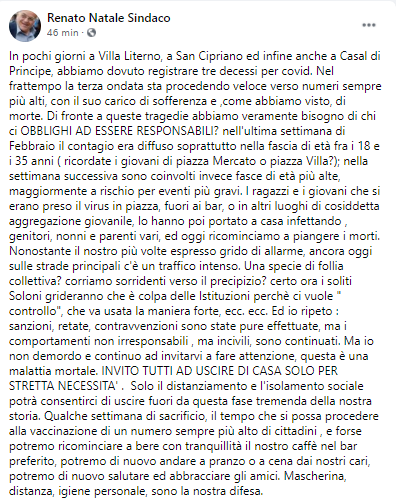 Questo il post pubblicato dal Sindaco di Casal di Principe Renato Natale sulla sua pagina Facebook: "In pochi giorni a Villa Literno, a San Cipriano ed infine anche a Casal di Principe, abbiamo dovuto registrare tre decessi per covid. Nel frattempo la terza ondata sta procedendo veloce verso numeri sempre più alti, con il suo carico di sofferenza e ,come abbiamo visto, di morte. Di fronte a queste tragedie - si legge nel post - abbiamo veramente bisogno di chi ci OBBLIGHI AD ESSERE RESPONSABILI? nell'ultima settimana di Febbraio il contagio era diffuso soprattutto nella fascia di età fra i 18 e i 35 anni ( ricordate i giovani di piazza Mercato o piazza Villa?); nella settimana successiva sono coinvolti invece fasce di età più alte, maggiormente a rischio per eventi più gravi. I ragazzi - prosegue il Sindaco - e i giovani che si erano preso il virus in piazza, fuori ai bar, o in altri luoghi di cosiddetta aggregazione giovanile, lo hanno poi portato a casa infettando , genitori, nonni e parenti vari, ed oggi ricominciamo a piangere i morti. Nonostante il nostro più volte espresso grido di allarme, ancora oggi sulle strade principali c'è un traffico intenso. Una specie - continua il sindaco di follia collettiva? corriamo sorridenti verso il precipizio? certo ora i soliti Soloni grideranno che è colpa delle Istituzioni perchè ci vuole " controllo", che va usata la maniera forte, ecc. ecc. Ed io ripeto : sanzioni, retate, contravvenzioni sono state pure effettuate, ma i comportamenti non irresponsabili , ma incivili, sono continuati. Ma io non demordo e continuo ad invitarvi a fare attenzione, questa è una malattia mortale. INVITO TUTTI AD USCIRE DI CASA SOLO PER STRETTA NECESSITA' . Solo il distanziamento e l'isolamento sociale - si legge nel post - potrà consentirci di uscire fuori da questa fase tremenda della nostra storia. Qualche settimana di sacrificio, il tempo che si possa procedere alla vaccinazione di un numero sempre più alto di cittadini , e forse potremo ricominciare a bere con tranquillità il nostro caffè nel bar preferito, potremo di nuovo andare a pranzo o a cena dai nostri cari, potremo di nuovo salutare ed abbracciare gli amici. Mascherina, distanza - conclude il Sindaco - igiene personale, sono la nostra difesa".