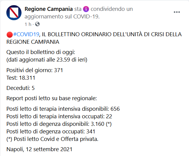Questo il post pubblicato sulla pagina Facebook della Regione Campania: "COVID 19, IL BOLLETTINO ORDINARIO DELL'UNITÀ DI CRISI DELLA REGIONE CAMPANIA. Questo - si legge - il bollettino di oggi: (dati aggiornati alle 23.59 di ieri) Positivi del giorno: 371 Test: 18.311 Deceduti: 5 Report posti letto su base regionale: Posti letto di terapia intensiva disponibili: 656 Posti letto di terapia intensiva occupati: 22 Posti letto di degenza disponibili: 3.160 (*) Posti letto di degenza occupati: 341 (*) Posti letto Covid e Offerta privata".