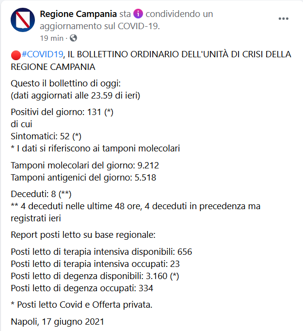 Questo il post pubblicato sulla pagina Facebook della Regione Campania;