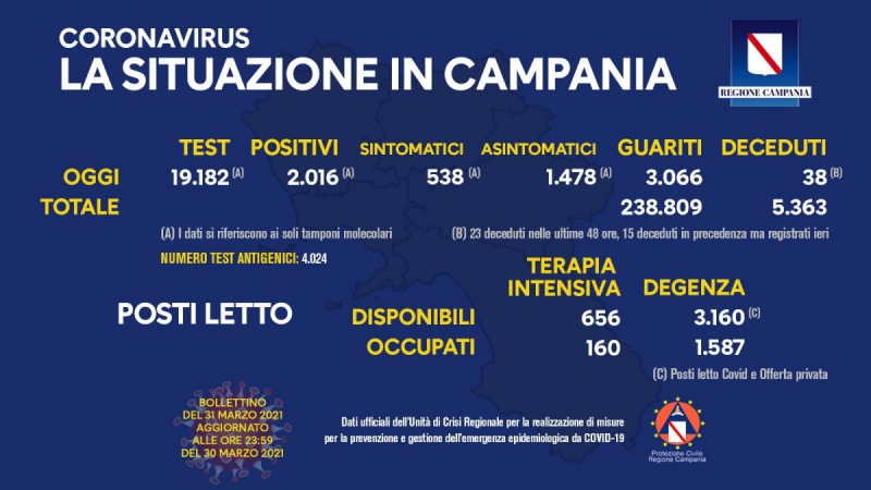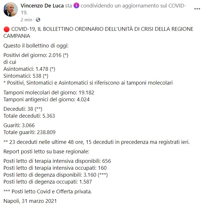 Questo quanto pubblicato sulla pagina fb del Pres. De Luca: "COVID-19, IL BOLLETTINO ORDINARIO DELL'UNITÀ DI CRISI DELLA REGIONE CAMPANIA Questo il bollettino di oggi: Positivi del giorno: 2.016 (*) di cui Asintomatici: 1.478 (*) Sintomatici: 538 (*) * Positivi, Sintomatici e Asintomatici si riferiscono ai tamponi molecolari Tamponi molecolari del giorno: 19.182 Tamponi antigenici del giorno: 4.024 Deceduti: 38 (**) Totale deceduti: 5.363 Guariti: 3.066 Totale guariti: 238.809 ** 23 deceduti nelle ultime 48 ore, 15 deceduti in precedenza ma registrati ieri. Report posti letto su base regionale: Posti letto di terapia intensiva disponibili: 656 Posti letto di terapia intensiva occupati: 160 Posti letto di degenza disponibili: 3.160 (***) Posti letto di degenza occupati: 1.587 *** Posti letto Covid e Offerta privata. Napoli, 31 marzo 2021"