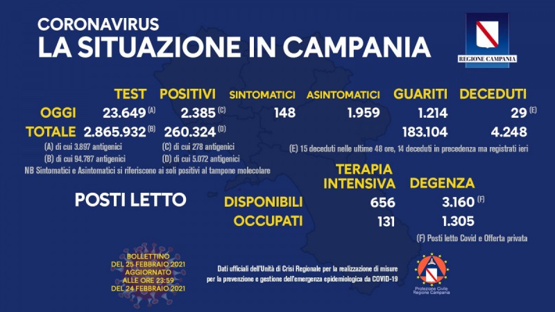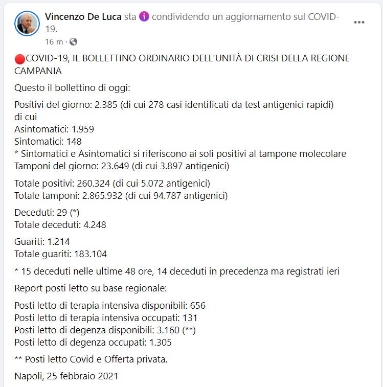 Questo quanto apprendiamo dalla pagina fb del Pres. De Luca: "COVID-19, IL BOLLETTINO ORDINARIO DELL'UNITÀ DI CRISI DELLA REGIONE CAMPANIA Questo il bollettino di oggi: Positivi del giorno: 2.385 (di cui 278 casi identificati da test antigenici rapidi) di cui Asintomatici: 1.959 Sintomatici: 148 * Sintomatici e Asintomatici si riferiscono ai soli positivi al tampone molecolare - si legge nella nota - Tamponi del giorno: 23.649 (di cui 3.897 antigenici) Totale positivi: 260.324 (di cui 5.072 antigenici) Totale tamponi: 2.865.932 (di cui 94.787 antigenici) Deceduti: 29 (*) Totale deceduti: 4.248 Guariti: 1.214 Totale guariti: 183.104 * 15 deceduti nelle ultime 48 ore, 14 deceduti in precedenza ma registrati ieri Report posti letto su base regionale: - si legge nella nota - Posti letto di terapia intensiva disponibili: 656 Posti letto di terapia intensiva occupati: 131 Posti letto di degenza disponibili: 3.160 (**) Posti letto di degenza occupati: 1.305 ** Posti letto Covid e Offerta privata. Napoli, 25 febbraio 2021"
