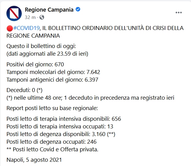 Questo il post pubblicato sulla pagina Facebook della Regione Campania: "COVID19 IL BOLLETTINO ORDINARIO DELL'UNITÀ DI CRISI DELLA REGIONE CAMPANIA. Questo il bollettino di oggi: (dati aggiornati alle 23.59 di ieri) Positivi del giorno: 670 Tamponi molecolari del giorno: 7.642 Tamponi antigenici del giorno: 6.397 Deceduti: 0 (*) (*) nelle ultime 48 ore; 1 deceduto in precedenza ma registrato ieri. Si legge - Report posti letto su base regionale: Posti letto di terapia intensiva disponibili: 656 Posti letto di terapia intensiva occupati: 13 Posti letto di degenza disponibili: 3.160 (**) Posti letto di degenza occupati: 246 ** Posti letto Covid e Offerta privata".