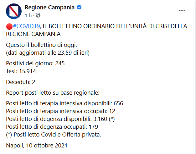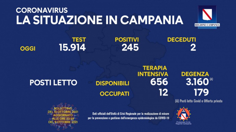 Questo il post pubblicato sulla pagina Facebook della regione Campania: "COVID19, IL BOLLETTINO ORDINARIO DELL'UNITÀ DI CRISI DELLA REGIONE CAMPANIA. Questo il bollettino di oggi: (dati aggiornati alle 23.59 di ieri) Positivi del giorno: 245. Test: 15.914. Deceduti: 2. Report posti letto su base regionale: Posti letto di terapia intensiva disponibili: 656. Posti letto - si legge - di terapia intensiva occupati: 12. Posti letto di degenza disponibili: 3.160 (*). Posti letto di degenza occupati: 179. (*) Posti letto Covid e Offerta privata. Napoli, 10 ottobre 2021"