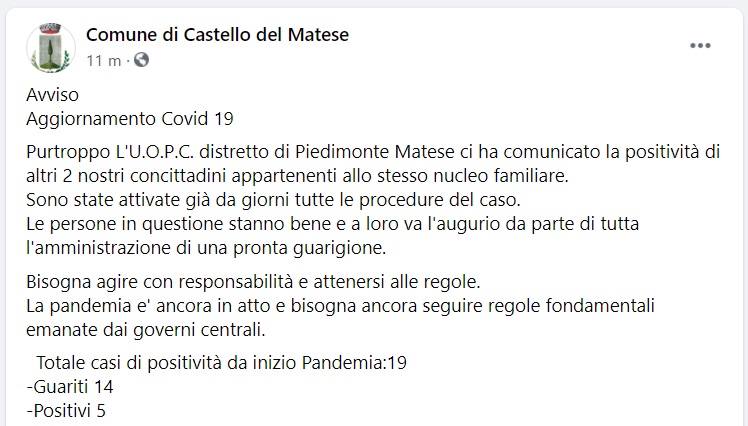 Questo quanto apprendiamo dalla pagina facebook del Comune di Castello del Matese: "Avviso Aggiornamento Covid 19 Purtroppo L'U.O.P.C. distretto di Piedimonte Matese ci ha comunicato la positività di altri 2 nostri concittadini appartenenti allo stesso nucleo familiare. Sono state - si legge nella nota - attivate già da giorni tutte le procedure del caso. Le persone in questione stanno bene e a loro va l'augurio da parte di tutta l'amministrazione di una pronta guarigione. Bisogna agire con responsabilità e attenersi alle regole. La pandemia e' ancora in atto e bisogna ancora seguire regole fondamentali - si legge nella nota - emanate dai governi centrali. Totale casi di positività da inizio Pandemia:19 -Guariti 14 -Positivi 5"