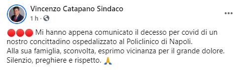Questo il testo del post pubblicato dal Sindaco di San Giuseppe Vesuviano Vincenzo Catapano: "Mi hanno appena comunicato il decesso per covid di un nostro concittadino ospedalizzato al Policlinico di Napoli. Alla sua famiglia - si legge nel post - sconvolta, esprimo vicinanza per il grande dolore. Silenzio, preghiere e rispetto".