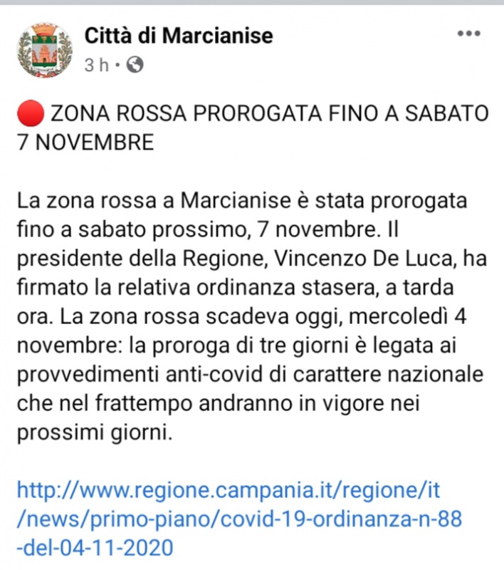 Con una ordinanza della Regione Campania emessa ieri in serata, il Presidente De Luca ha prorogato per Marcianise e Orta di Atella la zona rossa fino al 7 Novembre. Questo il testo del post della Citta' di Marcianise.