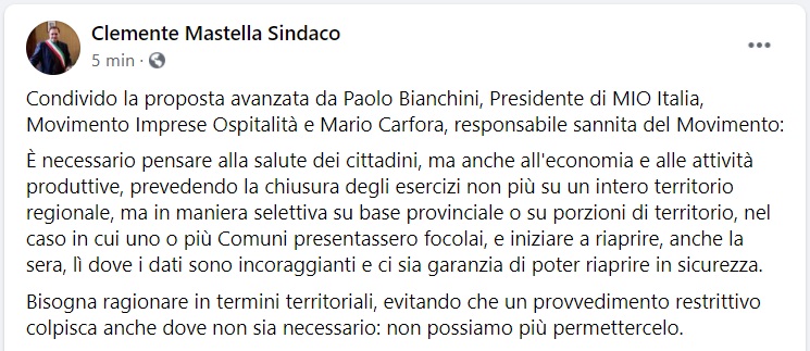 Questo quanto apprendiamo dalla pagina facebook del Sindaco di Benevento Mastella: "Condivido la proposta avanzata da Paolo Bianchini, Presidente di MIO Italia, Movimento Imprese Ospitalità e Mario Carfora, responsabile sannita del Movimento: È necessario - si legge nella nota - pensare alla salute dei cittadini, ma anche all'economia e alle attività produttive, prevedendo la chiusura degli esercizi non più su un intero territorio regionale, ma in maniera selettiva su base provinciale o su porzioni di territorio, nel caso in cui uno o più Comuni presentassero focolai - si legge nella nota -, e iniziare a riaprire, anche la sera, lì dove i dati sono incoraggianti e ci sia garanzia di poter riaprire in sicurezza. Bisogna ragionare in termini territoriali, evitando che un provvedimento restrittivo colpisca anche dove non sia necessario - si legge nella nota -: non possiamo più permettercelo."