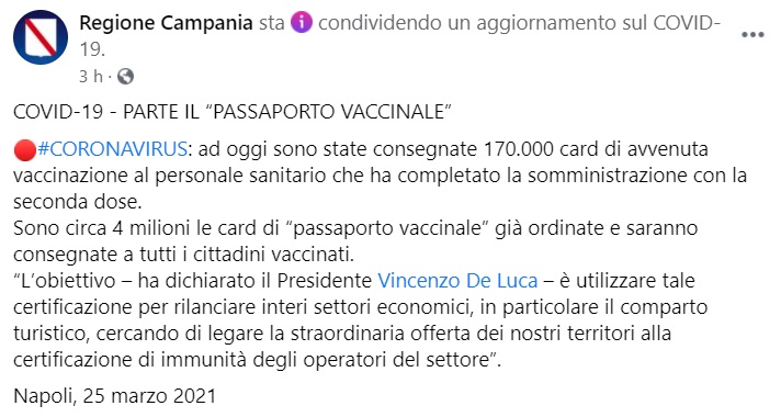 Questo quanto pubblicato sulla pagina fb della Regione Campania: "COVID-19 - PARTE IL “PASSAPORTO VACCINALE” CORONAVIRUS: ad oggi sono state consegnate 170.000 card di avvenuta vaccinazione al personale sanitario che ha completato la somministrazione con la seconda dose. Sono circa 4 milioni le card di “passaporto vaccinale” già ordinate - si legge nella nota - e saranno consegnate a tutti i cittadini vaccinati. “L’obiettivo – ha dichiarato il Presidente Vincenzo De Luca – è utilizzare tale certificazione per rilanciare interi settori economici, in particolare il comparto turistico, cercando di legare la straordinaria offerta dei nostri territori alla certificazione di immunità degli operatori del settore”. Napoli, 25 marzo 2021"