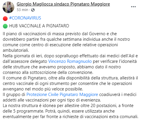 Questo il post pubblicato dal Sindaco di Pignataro Maggiore Giorgio Magliocca sulla sua pagina Facebook: "Il piano di vaccinazioni di massa previsto dal Governo e che dovrebbero partire fra qualche settimana individua anche il nostro comune come centro di esecuzione delle relative operazioni ambulatoriali. Nella giornata di ieri - si legge nel post - dopo sopralluogo effettuato dai medici dell'Asl e dall'assessore delegato Vincenzo Romagnuolo per verificare l'idoneità delle strutture che avevamo proposto, abbiamo dato il nostro consenso alla sottoscrizione della convenzione. Il comune di Pignataro - prosegue il post - oltre alla disponibilità della struttura, allestirà il centro vaccinale di ogni strumento per consentire che le operazioni avvengano nel modo più veloce possibile. Il gruppo di Protezione Civile Pignataro Maggiore coadiuverà i medici addetti alle vaccinazioni per ogni tipo di evenienza. La nostra struttura è idonea per allestire oltre 20 postazioni, a fronte delle 5 programmate. Potrà, quindi - conclude il post - essere utilizzata anche eventualmente per far fronte a richieste di vaccinazioni extra comunali".