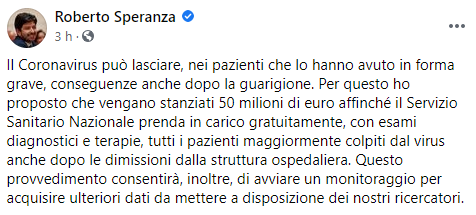 Questo il post pubblicato sulla sua pagina Facebook dal Ministro della Salute Roberto Speranza: "Il Coronavirus può lasciare, nei pazienti che lo hanno avuto in forma grave, conseguenze anche dopo la guarigione. Per questo - si legge nel post - ho proposto che vengano stanziati 50 milioni di euro affinché il Servizio Sanitario Nazionale prenda in carico gratuitamente, con esami diagnostici e terapie, tutti i pazienti maggiormente colpiti dal virus anche dopo le dimissioni dalla struttura ospedaliera. Questo provvedimento - prosegue il post - consentirà, inoltre, di avviare un monitoraggio per acquisire ulteriori dati da mettere a disposizione dei nostri ricercatori".