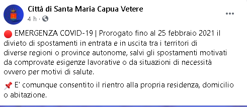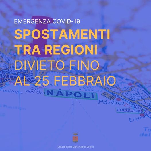 "EMERGENZA COVID-19 | Prorogato fino al 25 febbraio 2021 il divieto di spostamenti in entrata e in uscita tra i territori di diverse regioni o province autonome, salvi gli spostamenti motivati da comprovate esigenze lavorative o da situazioni di necessità ovvero per motivi di salute. E' comunque consentito il rientro alla propria residenza, domicilio o abitazione."