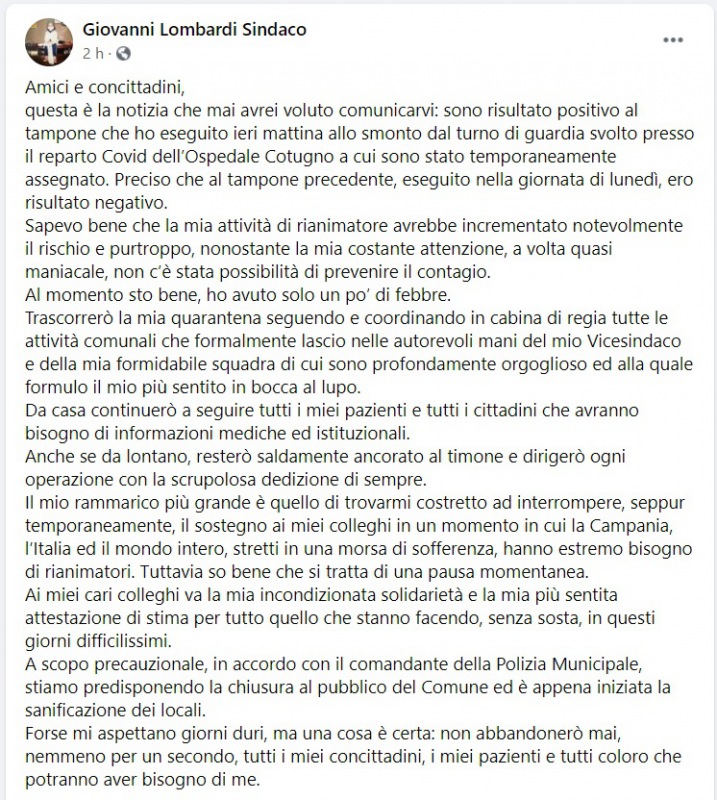 Questo quanto pubblicato sulla pagina fb del Sindaco di Calvi Risorta
