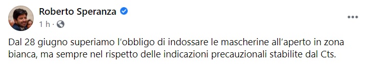 "Dal 28 giugno superiamo l’obbligo di indossare le mascherine all’aperto in zona bianca, -si legge nella nota- ma sempre nel rispetto delle indicazioni precauzionali stabilite dal Cts."
