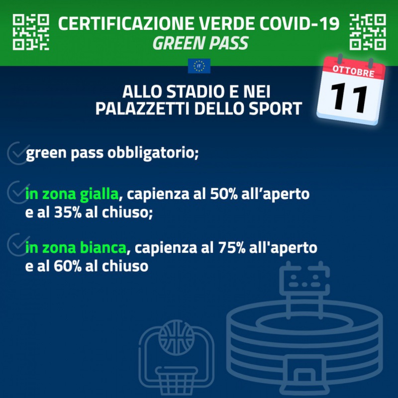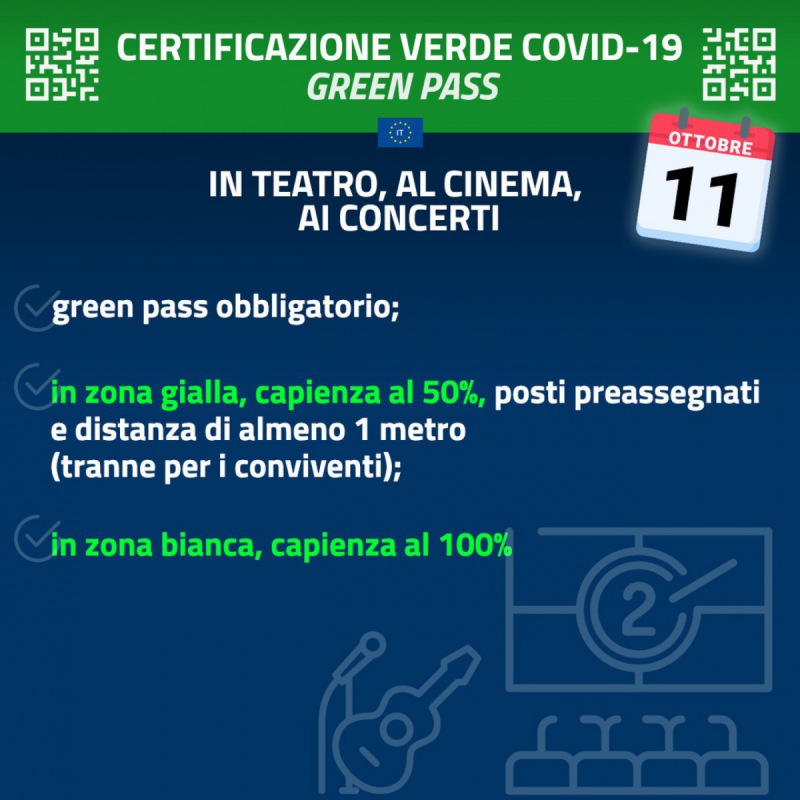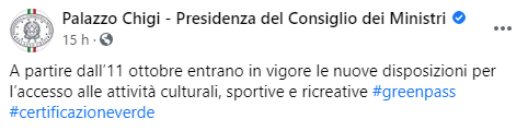 Questo il post pubblicato sulla pagina Facebook 'Palazzo Chigi-Presidenza del Consiglio dei Ministri': "A partire dall’11 ottobre entrano in vigore le nuove disposizioni per l’accesso alle attività culturali, sportive e ricreative".