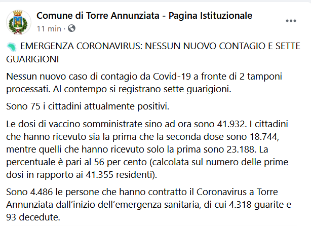 Questo il post pubblicato sulla pagina Facebook del Comune di Torre Annunziata: "Nessun nuovo caso di contagio da Covid-19 a fronte di 2 tamponi processati. Al contempo si registrano sette guarigioni. Sono 75 i cittadini attualmente positivi. Le dosi di vaccino somministrate sino ad ora - si legge - sono 41.932. I cittadini che hanno ricevuto sia la prima che la seconda dose sono 18.744, mentre quelli che hanno ricevuto solo la prima sono 23.188. La percentuale è pari al 56 per cento (calcolata sul numero delle prime dosi in rapporto ai 41.355 residenti). Sono 4.486 le persone che hanno contratto il Coronavirus a Torre Annunziata dall’inizio dell’emergenza sanitaria, di cui 4.318 guarite e 93 decedute - conclude.