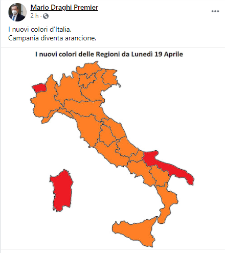 Questo il post pubblicato dal Presidente del Consiglio del Ministri Mario Draghi sulla sua pagina Facebook: "I nuovi colori d'Italia. Campania diventa arancione".