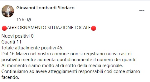 Questo il post pubblicato dal Sindaco di Calvi Risorta Giovanni Lombardi sulla sua pagina Facebook: "Aggiornamento situazione locale: Nuovi positivi 0, Guariti 11, Totale attualmente positivi 45. Dal 16 Marzo nel nostro comune non si registrano nuovi casi di positività - scrive il Sindaco - mentre aumenta quotidianamente il numero dei guariti. Al momento siamo molto al di sotto della media regionale. Continuiamo - conclude il Sindaco - ad avere atteggiamenti responsabili così come stiamo facendo".
