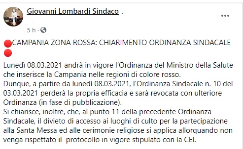 Questo il post pubblicato sulla sua pagina Facebook dal Sindaco di Calvi Risorta Giovanni Lombardi: "Campania Zona Rossa, chiarimento ordinanza sindacale. Lunedì 08.03.2021 andrà in vigore l’Ordinanza del Ministro della Salute che inserisce la Campania nelle regioni di colore rosso. Dunque, a partire da lunedì 08.03.2021, l’Ordinanza Sindacale n. 10 del 03.03.2021 perderà - si legge nel post - la propria efficacia e sarà revocata con ulteriore Ordinanza (in fase di pubblicazione). Si chiarisce, inoltre, che, al punto 11 della precedente Ordinanza Sindacale, il divieto di accesso ai luoghi di culto per la partecipazione alla Santa Messa ed alle cerimonie religiose si applica allorquando - conclude il post - non venga rispettato il protocollo in vigore stipulato con la CEI".