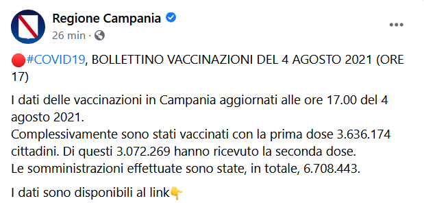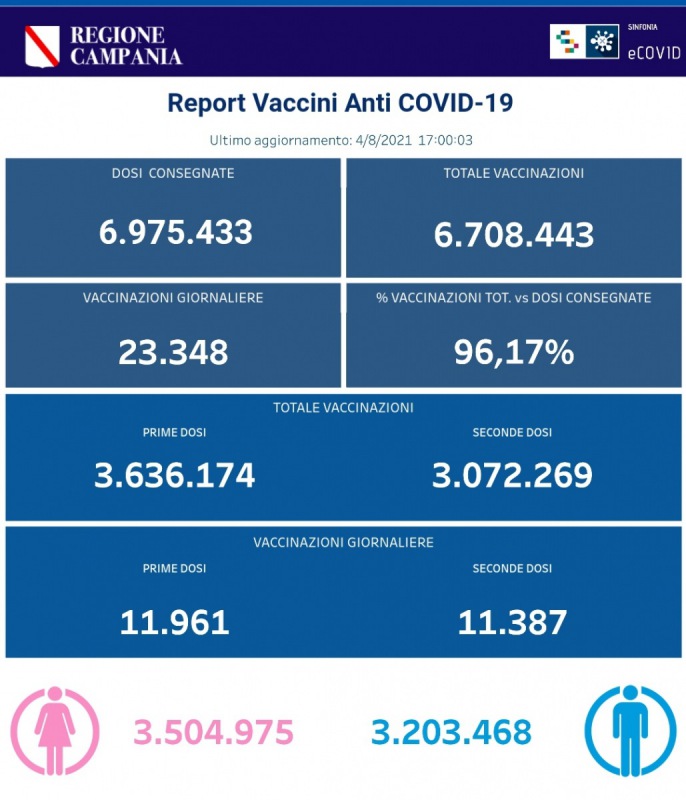 Questo il post apparso sulla pagina Facebook della Regione Campania: "COVID19 BOLLETTINO VACCINAZIONI DEL 4 AGOSTO 2021 (ORE 17) I dati delle vaccinazioni in Campania aggiornati alle ore 17.00 del 4 agosto 2021. Complessivamente - si legge - sono stati vaccinati con la prima dose 3.636.174 cittadini. Di questi 3.072.269 hanno ricevuto la seconda dose. Le somministrazioni effettuate sono state, in totale, 6.708.443. I dati sono disponibili al link CLICCA QUI".