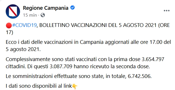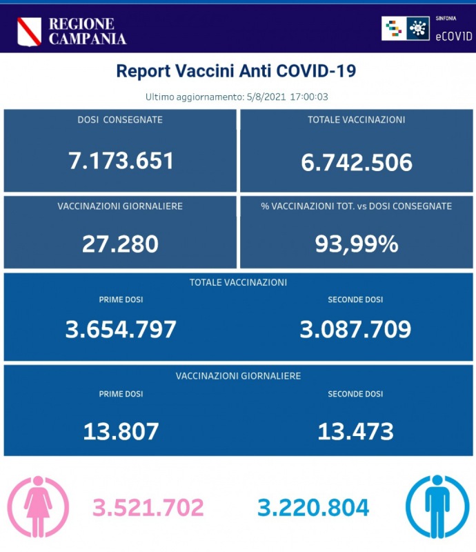 Questo il post pubblicato sulla pagina Facebook della Regione Campania: "COVID19, BOLLETTINO VACCINAZIONI DEL 5 AGOSTO 2021 (ORE 17). Ecco i dati delle vaccinazioni in Campania aggiornati alle ore 17.00 del 5 agosto 2021. Complessivamente - si legge -sono stati vaccinati con la prima dose 3.654.797 cittadini. Di questi 3.087.709 hanno ricevuto la seconda dose. Le somministrazioni effettuate sono state, in totale, 6.742.506. I dati sono disponibili al link" CLICCA QUI
