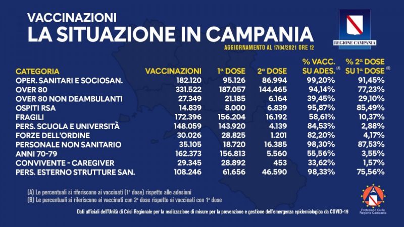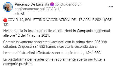 Questo il post pubblicato sulla sua pagina Facebook dal Presidente della Regione Campania Vincenzo De Luca: "Covid-19, bollettino vaccinazioni del 17 aprile 2021 (ore 12). Nella tabella in foto i dati delle vaccinazioni in Campania aggiornati alle ore 12 del 17 aprile 2021. Complessivamente si legge nel post - sono stati vaccinati con la prima dose 906.398 cittadini. Di questi 334.982 hanno ricevuto la seconda dose. Le somministrazioni effettuate sono state, in totale, 1.241.380. La piattaforma per le adesioni è regolarmente aperta - conclude il post - per tutte le categorie previste".