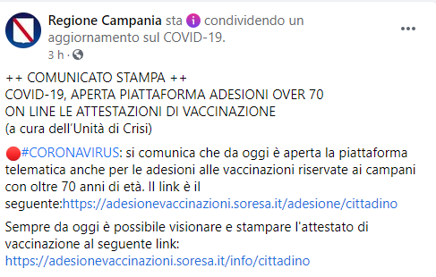 Questo parte del post pubblicato sulla pagina Facebook 'Regione Campania': "(...)Coronavirus: si comunica che da oggi è aperta la piattaforma telematica anche per le adesioni alle vaccinazioni riservate ai campani con oltre 70 anni di età. Il link è il seguente: https://adesionevaccinazioni.soresa.it/adesione/cittadino. Sempre da oggi - si legge ancora nel post - è possibile visionare e stampare l'attestato di vaccinazione al seguente link https://adesionevaccinazioni.soresa.it/info/cittadino".