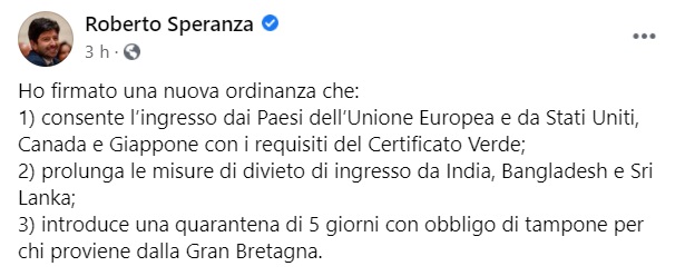 "Ho firmato una nuova ordinanza che: 1) consente l’ingresso dai Paesi dell’Unione Europea e da Stati Uniti, Canada e Giappone con i requisiti del Certificato Verde; 2) prolunga le misure di divieto di ingresso da India, Bangladesh e Sri Lanka; 3) introduce una quarantena di 5 giorni con obbligo di tampone per chi proviene dalla Gran Bretagna."