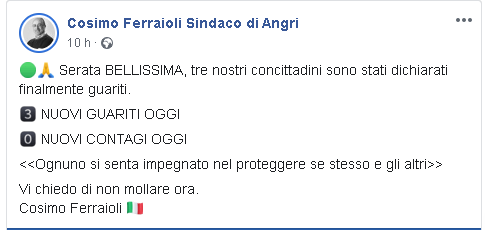 "Serata BELLISSIMA, tre nostri concittadini sono stati dichiarati finalmente guariti. 3 NUOVI GUARITI OGGI. 0 NUOVI CONTAGI OGGI. <<Ognuno si senta impegnato nel proteggere se stesso e gli altri>>. Vi chiedo di non mollare ora. Cosimo Ferraioli".