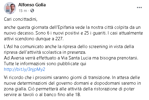 Lo apprendiamo dalla pagina Facebook di Alfonso Golia, Sindaco di Aversa.