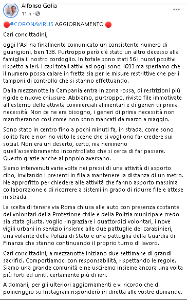 Lo apprendiamo dalla pagina facebook di Alfonso Golia, Sindaco di Aversa.
