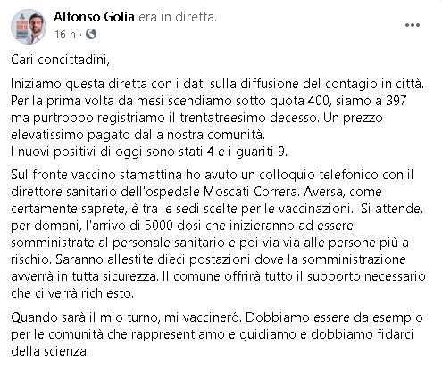 Lo apprendiamo dalla pagina Facebook del Sindaco di Aversa, Alfonso Golia.