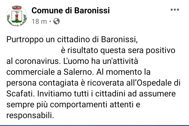 "Purtroppo un cittadino di Baronissi, ...è risultato questa sera positivo al coronavirus. L'uomo ha un'attività commerciale a Salerno. Al momento la persona contagiata è ricoverata all’Ospedale di Scafati. Invitiamo tutti i cittadini ad assumere sempre più comportamenti attenti e responsabili."