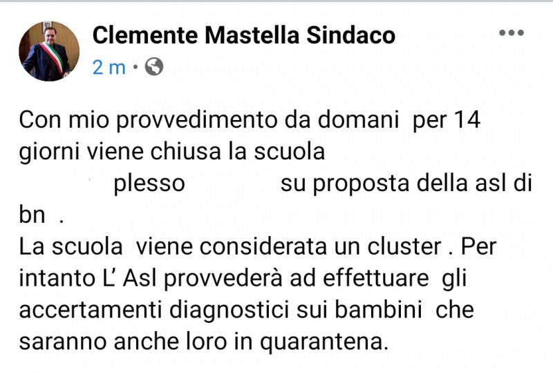 COVID19 BENEVENTO: "Chiuso plesso scuola per 14 giorni. Considerato un cluster"