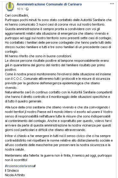 Lo apprendiamo dalla pagina Facebook Amministrazione Comunale di Carinaro.
