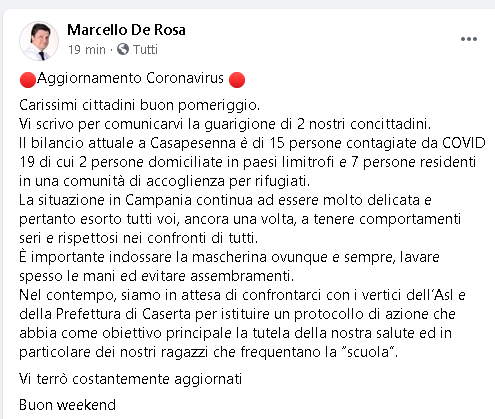 Lo apprendiamo dalla pagina Facebook di Marcello De Rosa, Sindaco di Casapesenna.