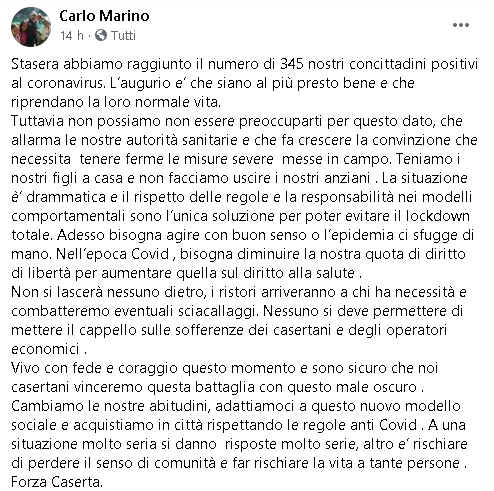 Lo apprendiamo dalla bacheca Facebook del Sindaco di Caserta, Carlo Marino.