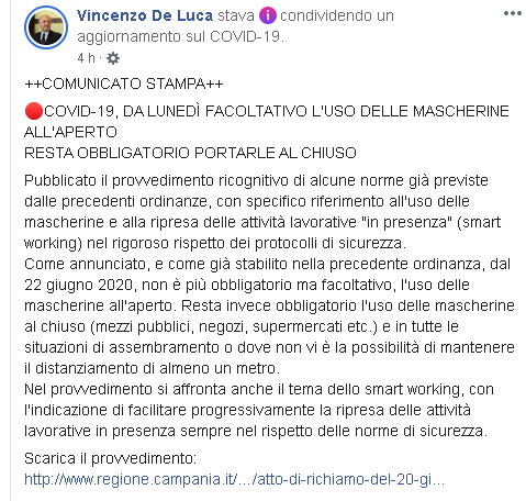 Lo apprendiamo dalla pagina Facebook del Governatore della Regione Campania, Vincenzo De Luca: