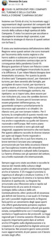 Insieme con l'Unità di crisi, ho incontrato oggi i rappresentanti degli operatori del comparto del turismo e successivamente i rappresentanti del mondo della cultura e degli spettacoli della Campania. È stata l'occasione per ascoltare e raccogliere le istanze degli operatori, e per illustrare le strategie di rilancio di questi settori con la Fase 2. È stata una testimonianza dell'attenzione della Regione verso questi settori che sono trainanti per l'economia della nostra regione e che hanno subito e subiscono proprio in queste settimane un durissimo contraccolpo per le conseguenze della pandemia Covid-19. Bisogna guardare al futuro con fiducia e avere coraggio, per sconfiggere innanzitutto la paura e la diffidenza. E per ridare fiducia bisogna dare innanzitutto sicurezza. Per questo la parola d'ordine sarà "Campania sicura", per rilanciare il turismo, per dare serenità alle famiglie, per accogliere di nuovo i turisti, per riportare la gente a teatro, al cinema. Tutto a piccoli passi, con il costante monitoraggio sanitario, ma ripetiamo: se si riapre tutto, deve essere per non richiudere più, cosa che sarebbe davvero insostenibile. Occorre perciò lavorare senza essere prigionieri dell'emergenza, ma garantendo sempre e prioritariamente la sicurezza agli operatori e ai cittadini. Un rilancio vero, per non tornare indietro. Per il turismo, la complessità di questo mondo non può basarsi solo sul sostegno della Regione ma anche e soprattutto su quello del Governo nazionale e dell'Europa. Nel nostro piano economico e sociale ci sono già aiuti agli stagionali, sappiamo benissimo che non basta. Per questo abbiamo raccolto le diverse istanze per agire sul doppio fronte regionale e nazionale. Quello che si può fare intanto, e a breve termine è lanciare una campagna promozionale per fare della sicurezza il brand per l'accoglienza insieme alle straordinarie bellezze ambientali e culturali della Campania. Lo faremo d'intesa con gli operatori del settore, sia a livello nazionale che internazionale. Sempre oggi sono state ascoltate e raccolte le istanze del mondo della cultura e degli spettacoli, settore peraltro strettamente legato anche al turismo. Il 25 maggio è prevista la riapertura di alberghi e strutture ricettive, il 15 giugno la riapertura di cinema e la ripresa delle iniziative di spettacolo. La Regione ha annunciato una riflessione seria e rapida sul finanziamento di una serie di misure a sostegno della cultura e delle arti. Contestualmente, oltre i protocolli di sicurezza già definiti dal Governo, e sui quali c'è il tempo per tutti i possibili miglioramenti, la Regione farà partire un censimento degli spazi aperti che offerti gratuitamente potranno ospitare spettacoli e manifestazioni culturali già questa estate, compatibilmente con il monitoraggio sanitario e l'applicazione dei protocolli. Le leggi regionali per il cinema saranno rifinanziate. Un supporto importante potrà dare al settore anche il Progetto sulla digitalizzazione e la creazione di una piattaforma digitale unica per la Campania. Nei prossimi giorni sono previsti nuovi aggiornamenti, di pari passo con il lavoro avviato dagli uffici."