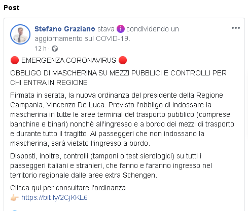 Lo apprendiamo dalla pagina Facebook del Governatore della Regione Campania, Vincenzo De Luca: