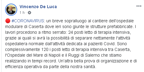 Lo apprendiamo dalla pagina Facebook del Governatore della Regione Campania, Vincenzo De Luca:
