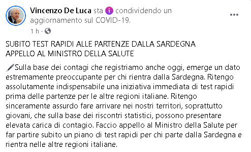 Lo apprendiamo dalla pagina Facebook del Presidente della Regione Campania, Vincenzo De Luca.